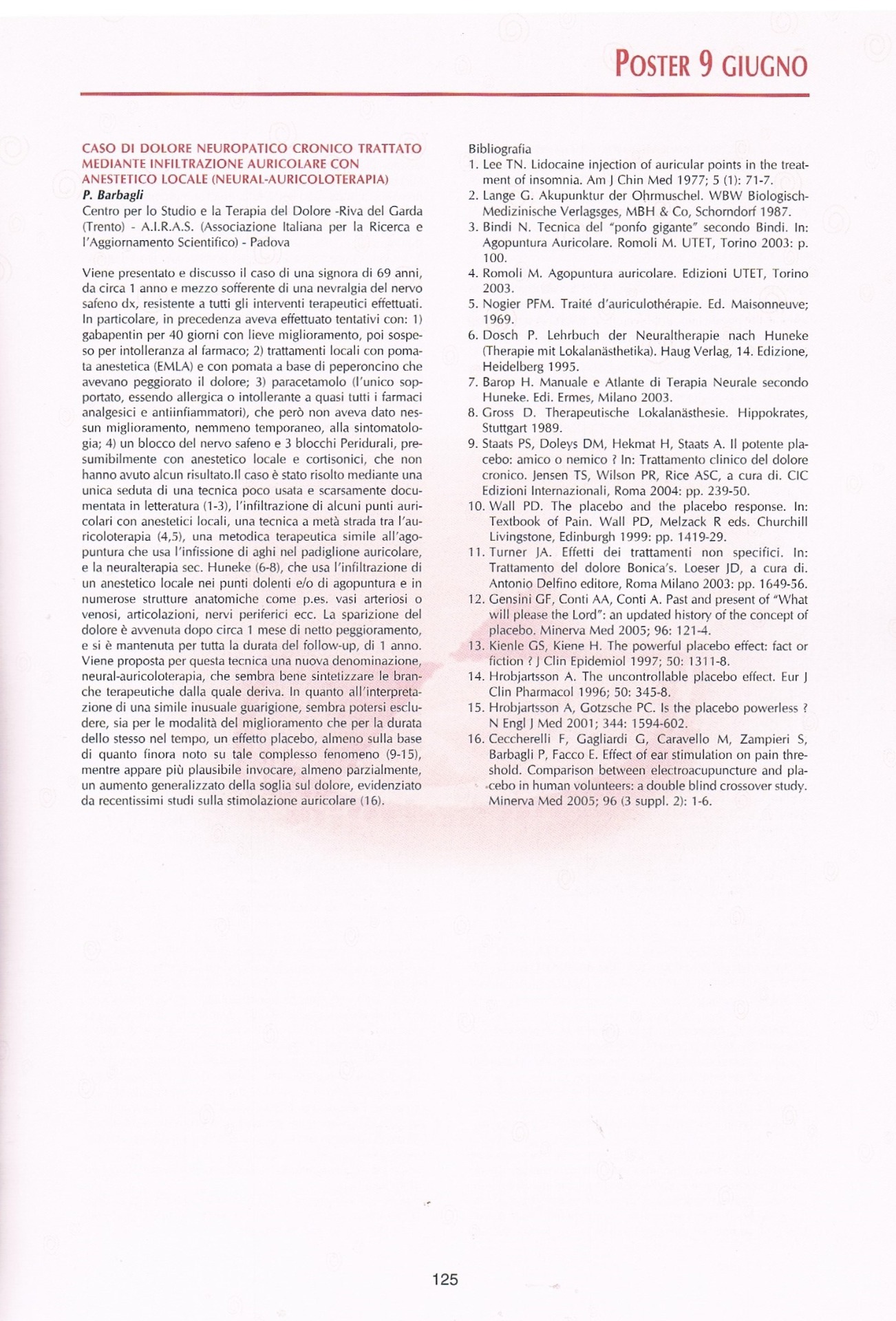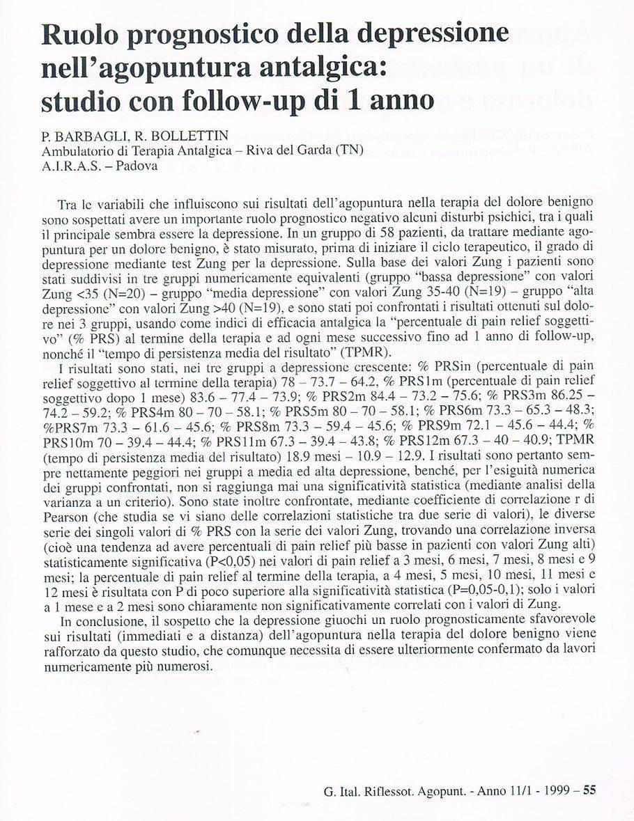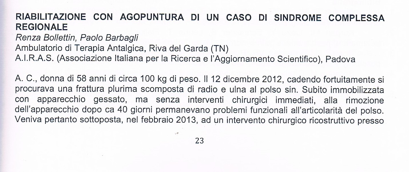 9. Barbagli P, Bollettin R. Risultati antalgici immediati e a distanza di due tecniche riflessoterapiche (agopuntura e neuralterapia sec. Huneke) nella lombosciatalgia cronica benigna. Atti XVI Congresso Nazionale S.I.R.A.A. - Genova 28-29 settembre 2001.