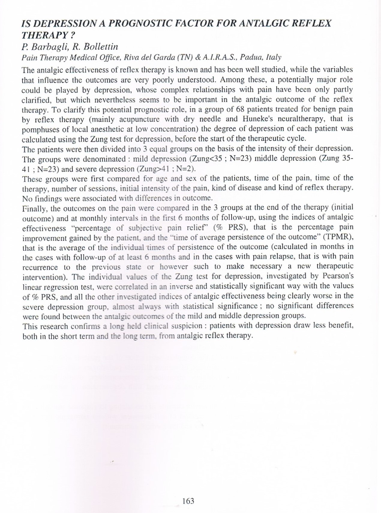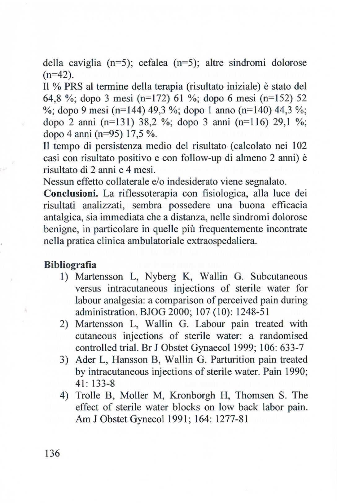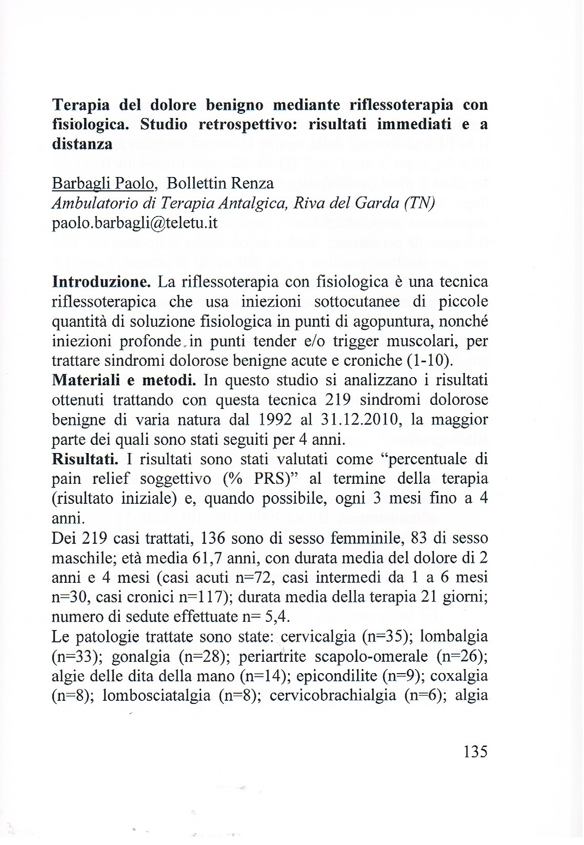 9. Barbagli P, Bollettin R. Risultati antalgici immediati e a distanza di due tecniche riflessoterapiche (agopuntura e neuralterapia sec. Huneke) nella lombosciatalgia cronica benigna. Atti XVI Congresso Nazionale S.I.R.A.A. - Genova 28-29 settembre 2001.