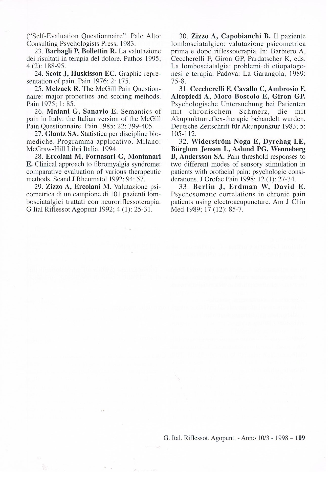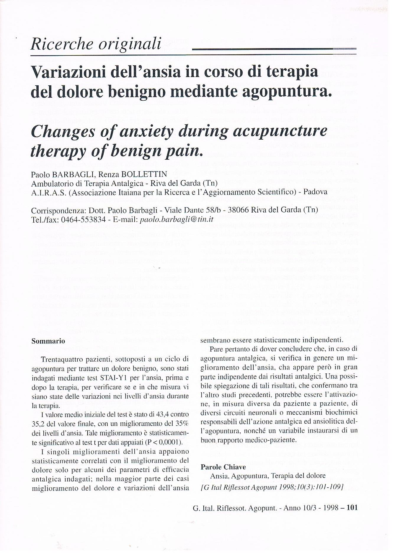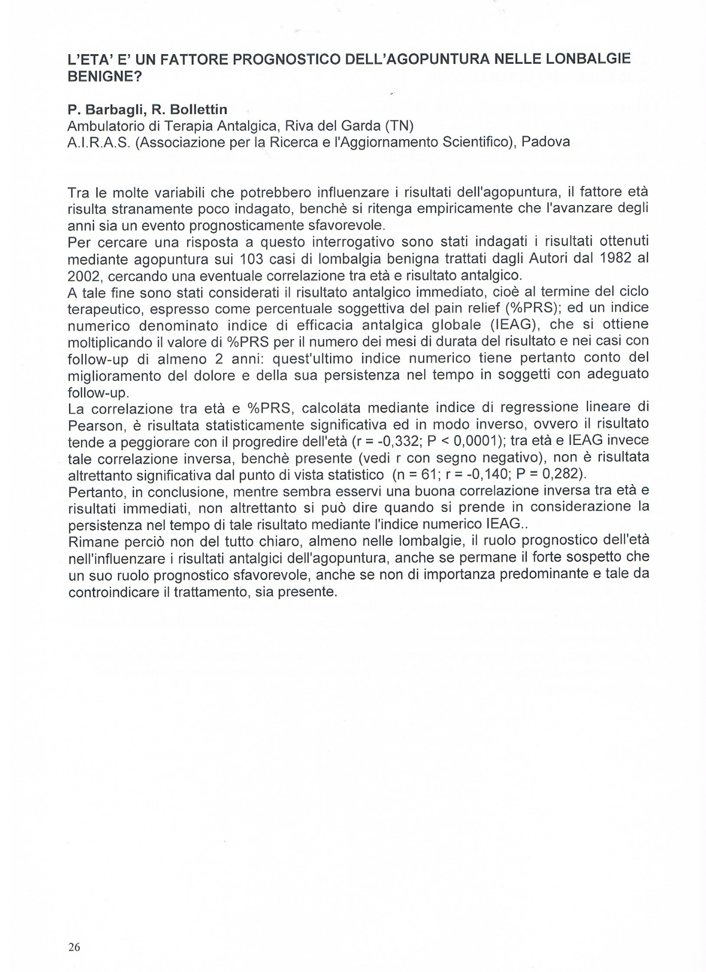 Barbagli P., Bollettin R. Is depression a prognostic factor of the antalgic reflex therapy ? In: Abstract book: COST B4 - Unconventional medicine at the beginning of the third millennium - Time for integration. Pavia 4-6 giugno 1998, pag. 163