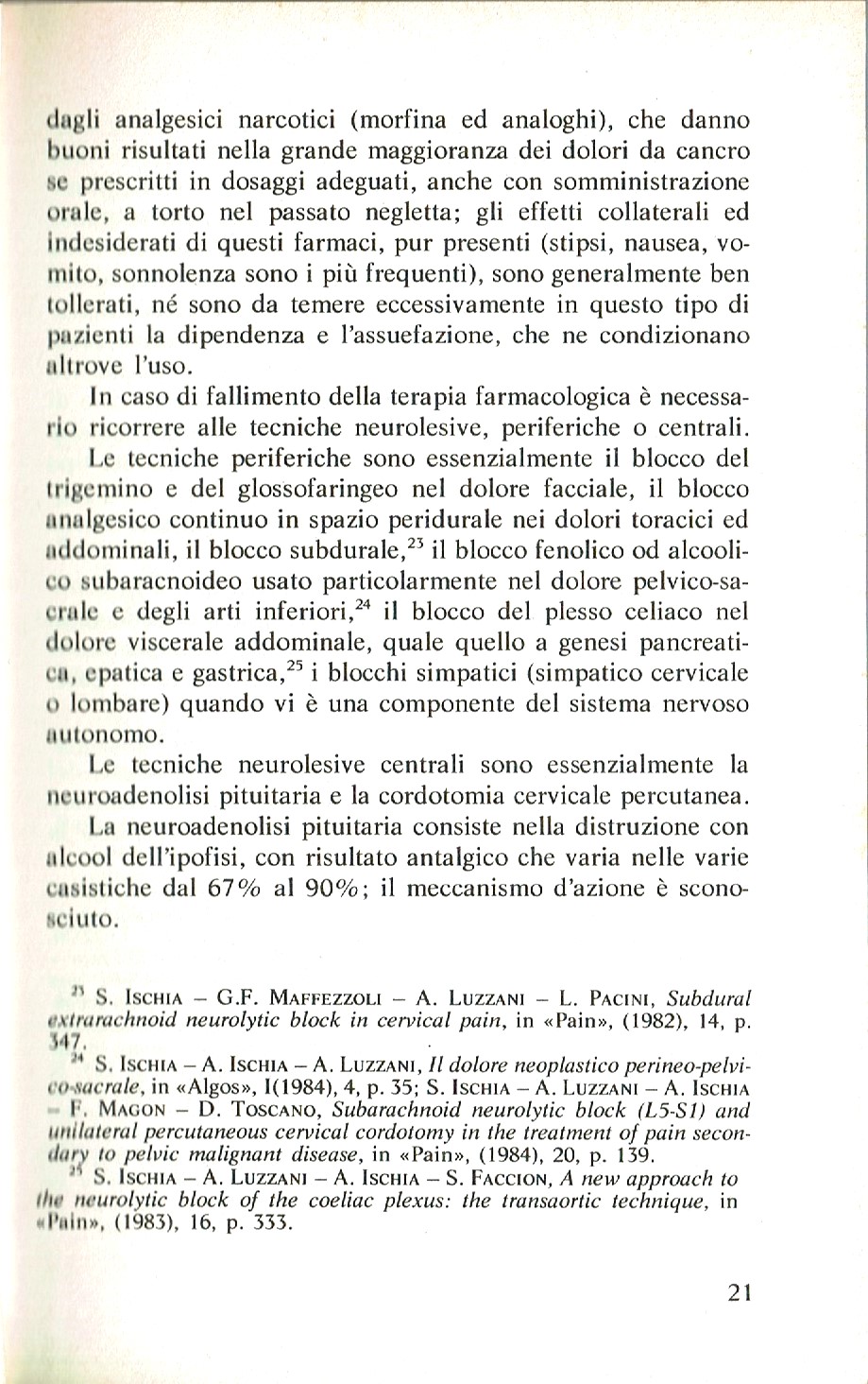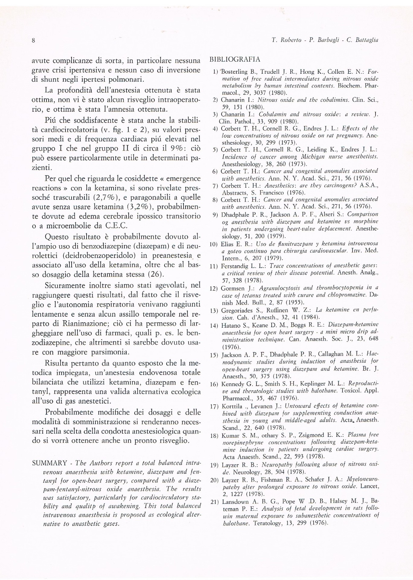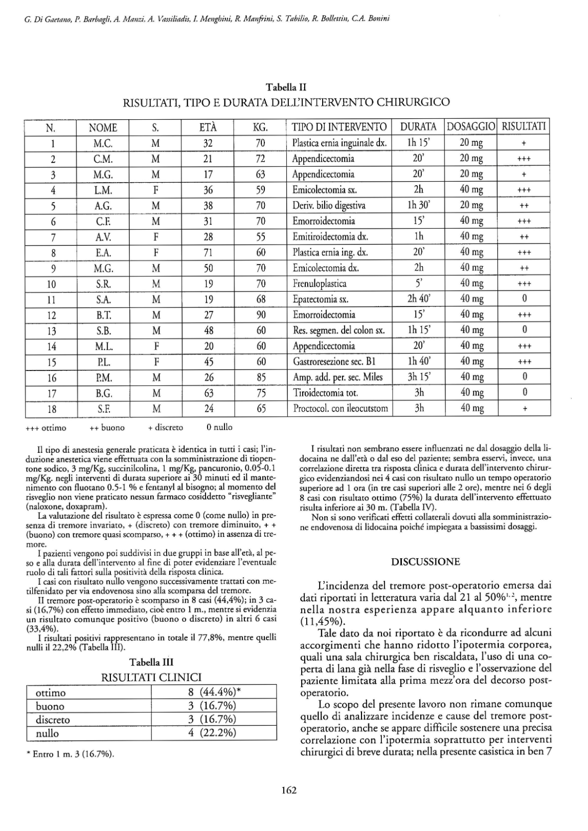 RISULTATI. In 8 casi (44,4 %) il risultato è stato "ottimo" (in 3 casi (16,7 %) entro 1 minuto), in 3 casi (16,7 %) è stato "buono", in altri 3 (16,7 %) "discreto", in 4 (22,2 %) "nullo". I risultati non sembrano essere stati influenzati né dal dosaggio della lidocaina, né dal peso o dall'età del paziente, mentre pare esserci una correlazione inversa tra il risultato e la durata dell'intervento.