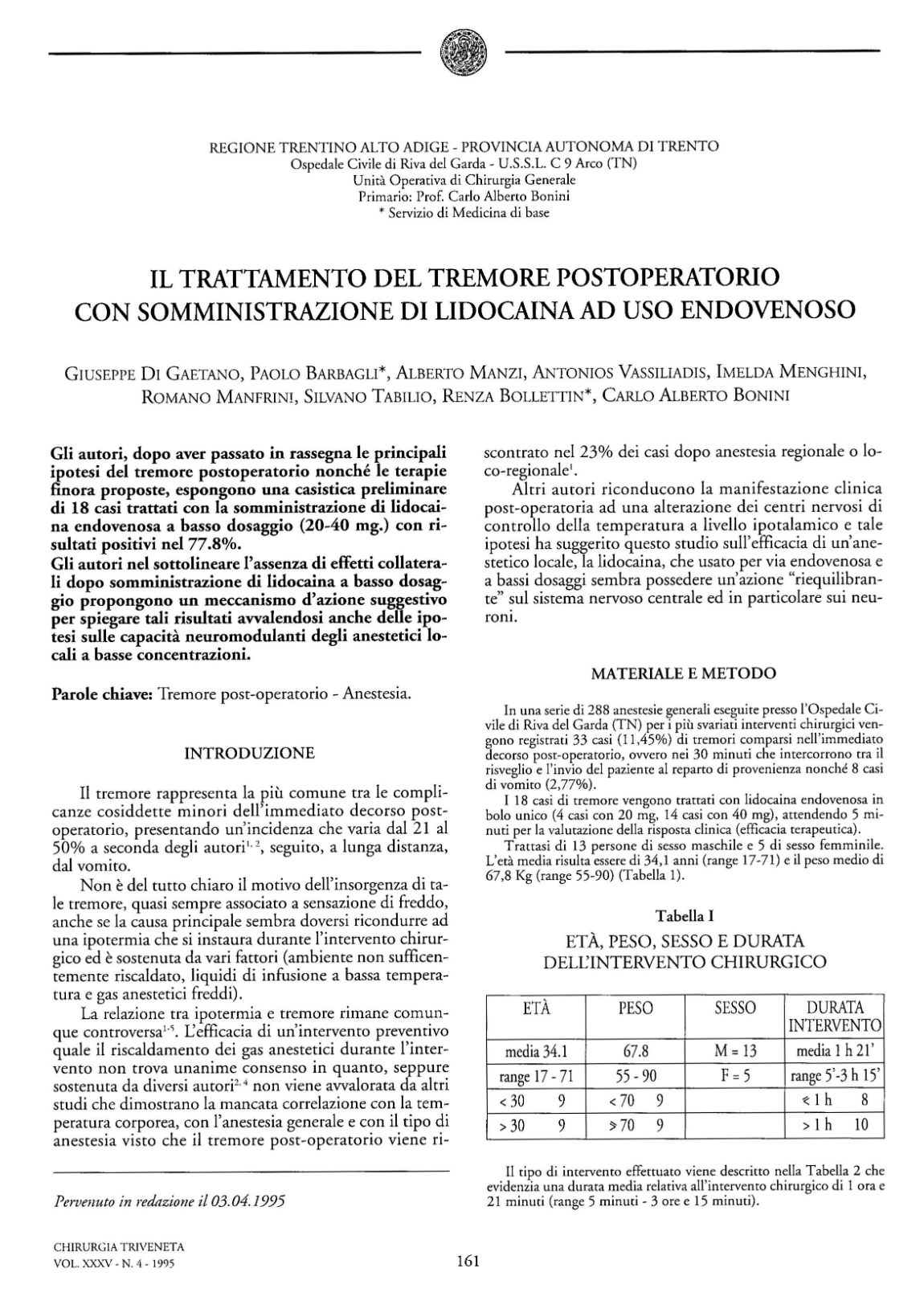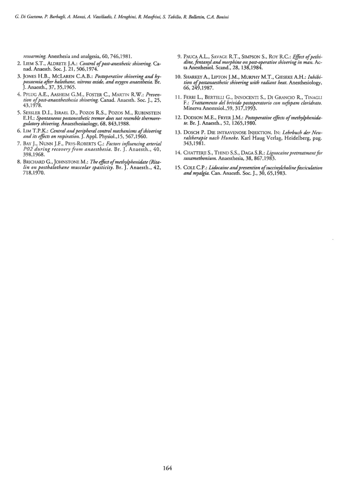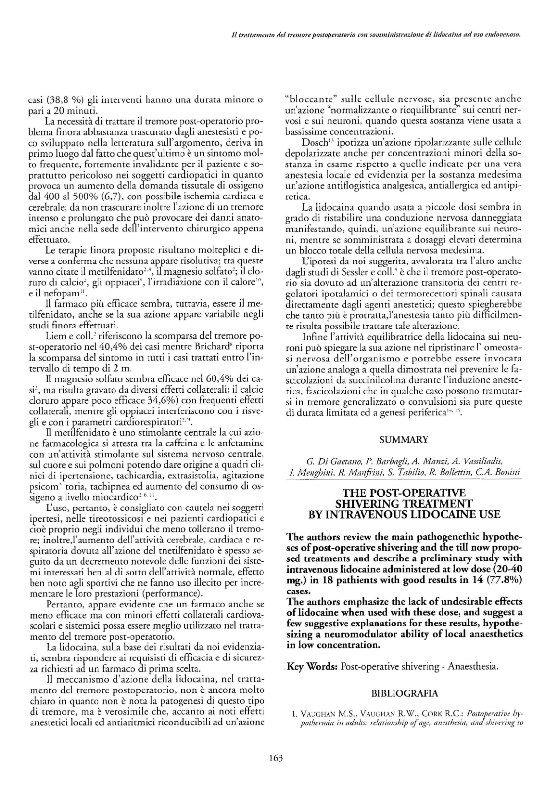 Di Gaetano G, Barbagli P, Manzi A, Vasiliadis A, Menghini I, Manfrini R, Tabilio S, Bollettin R, Bonini CA. The post-operative shivering treatment by intravenous lidocaine use. Chirurgia Triveneta 1995; XXXV (4): 161-4.
